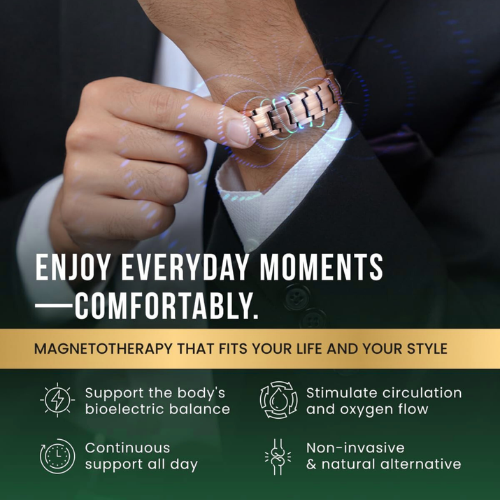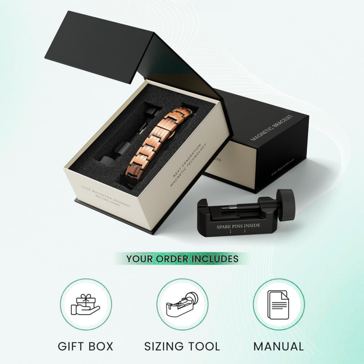 Transform your health and style with this elegant bracelet that offers natural pain relief through the healing properties of copper and strategically placed magnets, making it a must-have for those seeking both aesthetics and wellness.